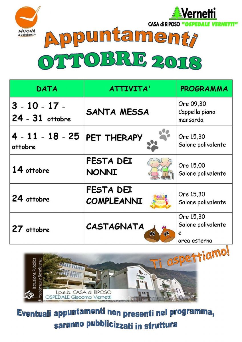 Appuntamenti in struttura per il mese di ottobre 2018