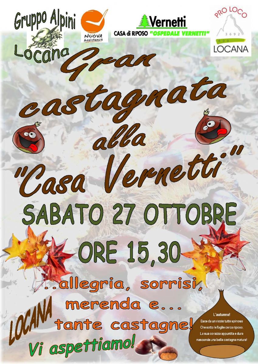 Sabato 27 ottobre alle ore 15,30 "Gran Castagnata alla Casa Vernetti" in coolaborazione con il Gruppo Alpini di Locana e la Pro Loco di Locana... Il pomeriggio sarà "condito" da allegria. sorrisi e...tante castagne!