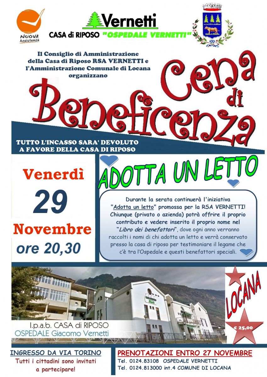 Tutti i cittadini sono invitati a partecipare alla cena organizzata dal Consiglio di Amministrazione del Vernetti e dal Comune di Locana per venerdì 29 novembre 2019 alle ore 20,30 presso la struttura. Ingresso da via Torino.