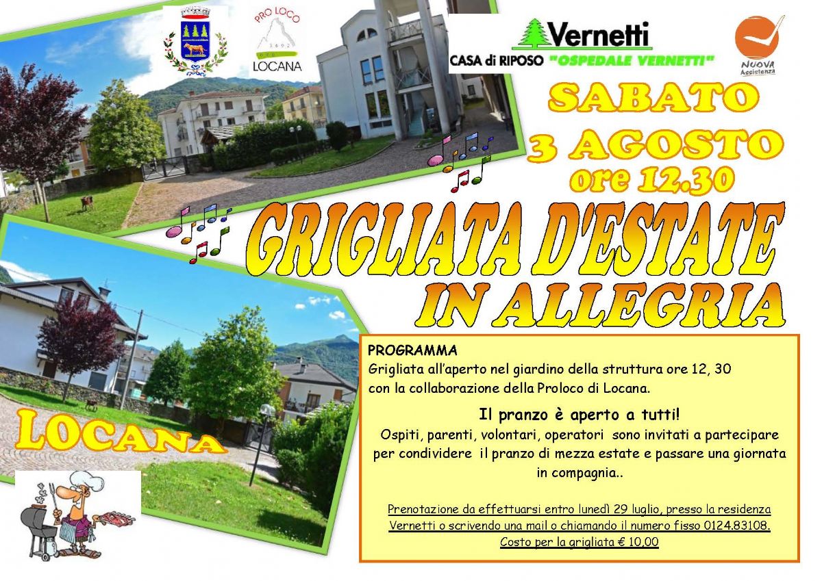 Prenotazione da effettuarsi entro lunedì 29 luglio, presso la residenza Vernetti o scrivendo una mail o chiamando il numero fisso 0124.83108.
