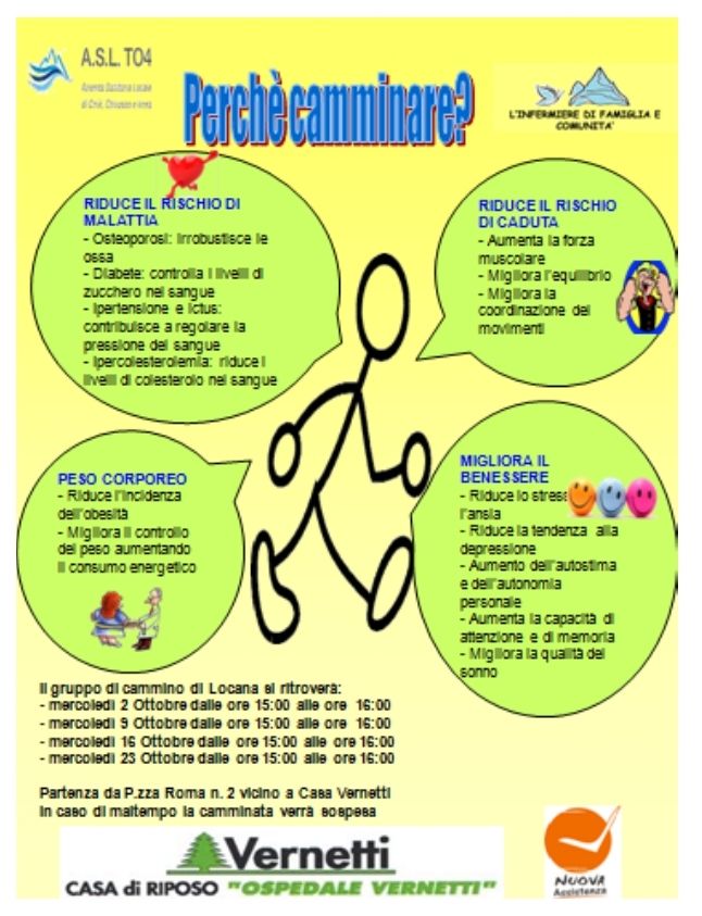 Camminare riduce il rischio di malattia; riduce il rischio di caduta; riduce e migliora il peso corporeo; migliora il benessere.