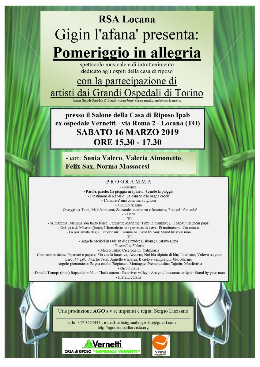 Spettacolo musicale e di intrattenimento per gli ospiti della casa di Riposo con la partecipazione di artisti dai Grandi Ospedali di Torino presso il Salone della Casa di Riposo Ipab ex ospedale Vernetti - via Roma 2 - Locana (TO)