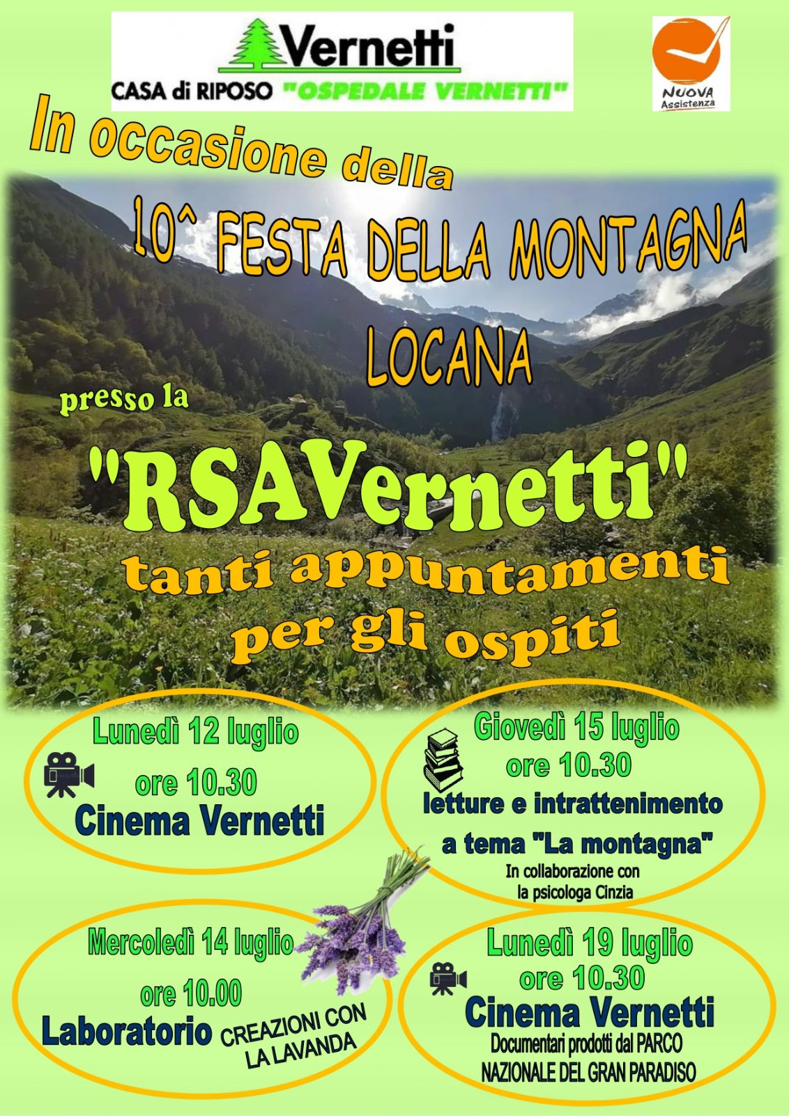 In occasione della 10^ FESTA DELLA MONTAGNA che si terrà a Locana dal 12 al 18 luglio, la Residenza Vernetti propone attività, laboratori, letture e cinema a tema "LA MONTAGNA E LA NATURA" presso il salone polivalente della Residenza Vernetti.