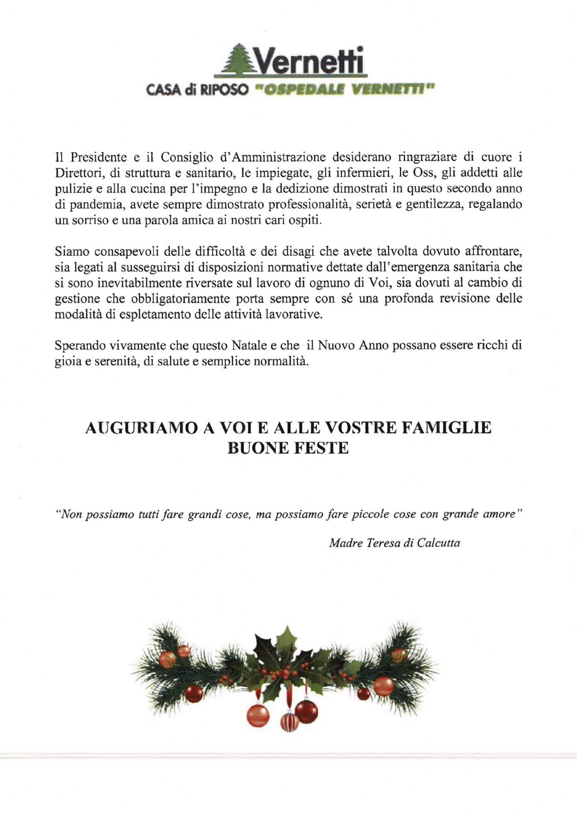 Grazie di cuore ai direttori di struttura, alle impiegate, agli infermieri, operatori socio-sanitari, addetti pulizie, addetti cucina per l'impegno e la dedizione dimostrati alla RSA VERNETTI in questo secondo anno di pandemia.
