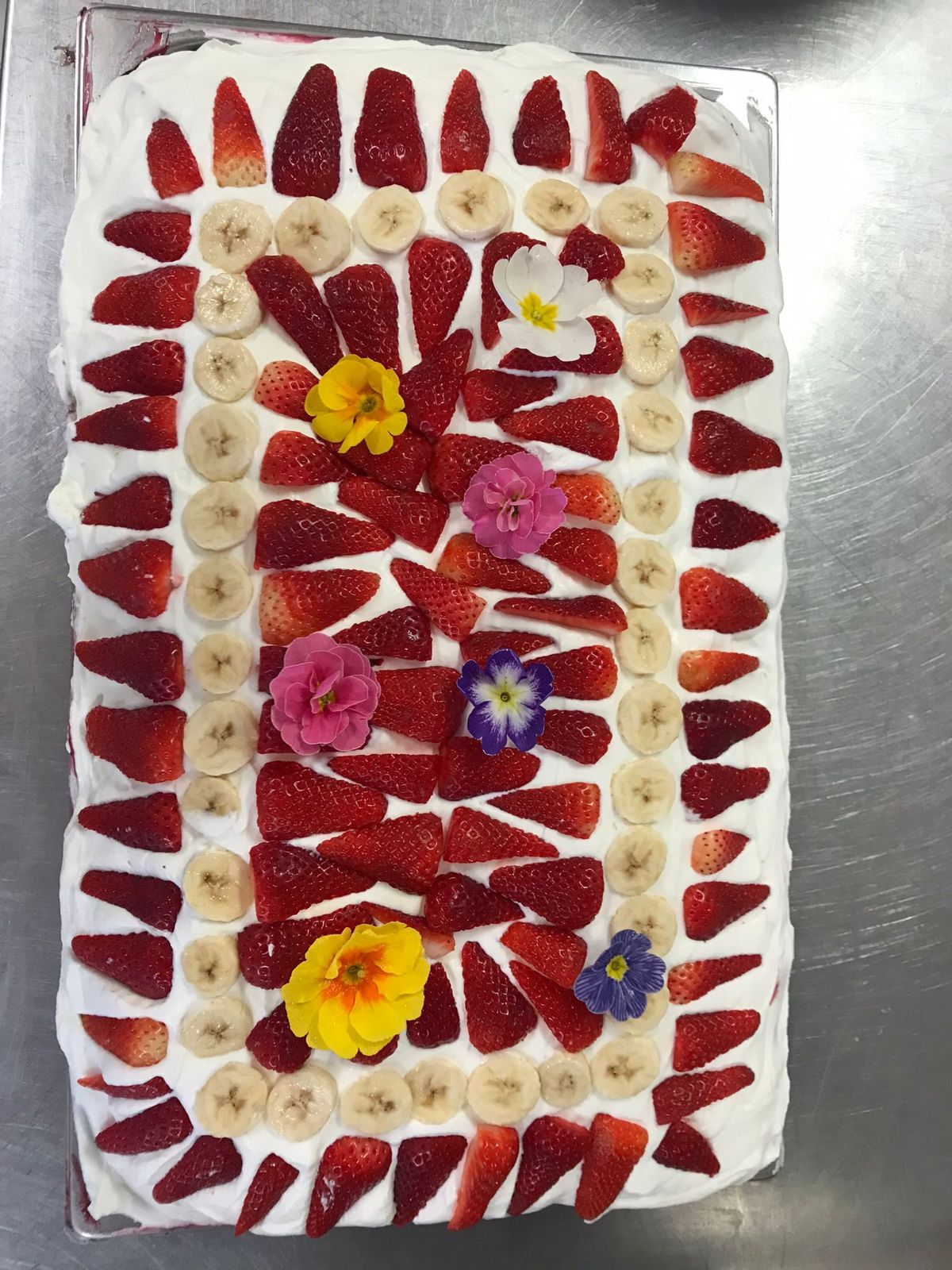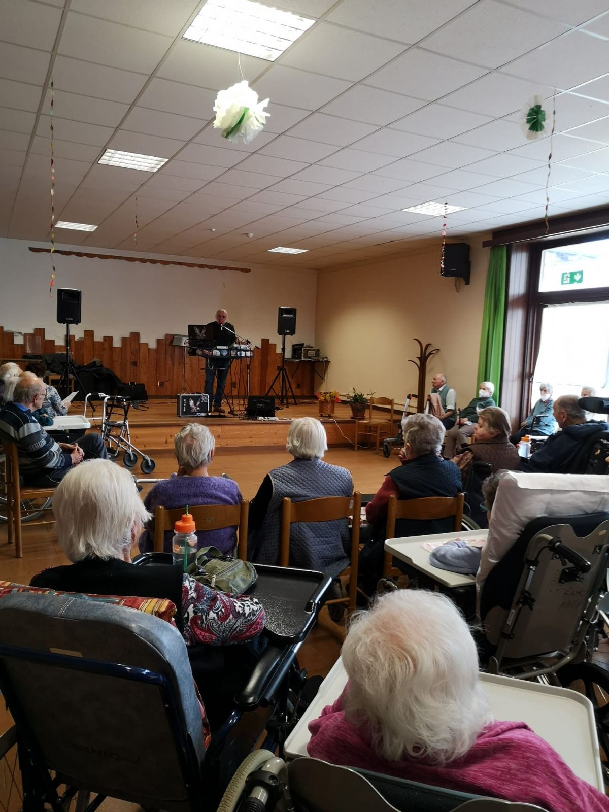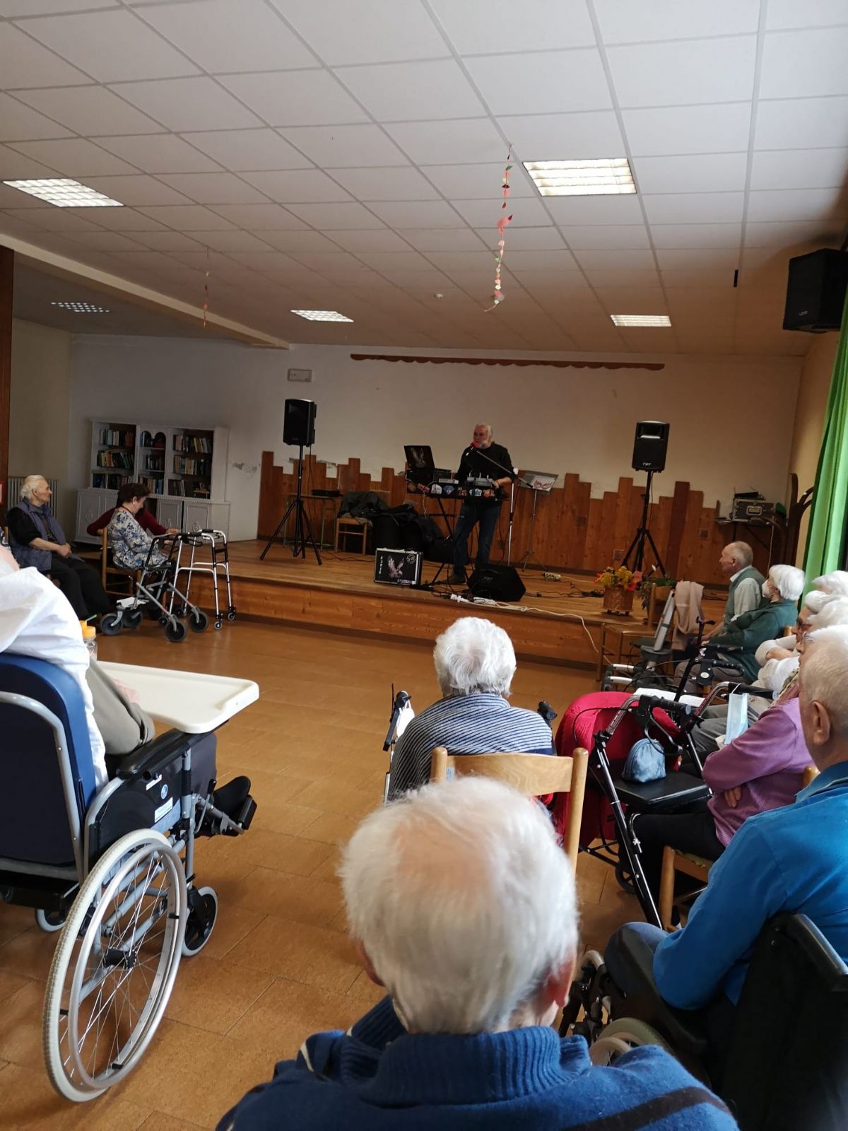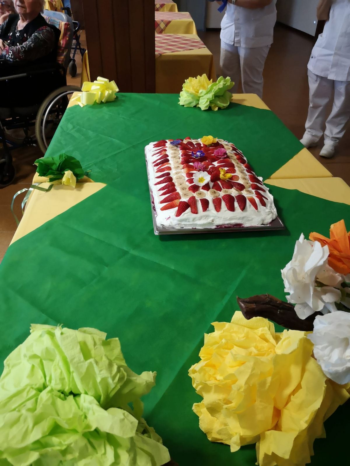 Salone delle feste della RSA VERNETTI con la musica di Savio e la dolcezza della torta alla frutta cucinata dalla cuoca Monica.